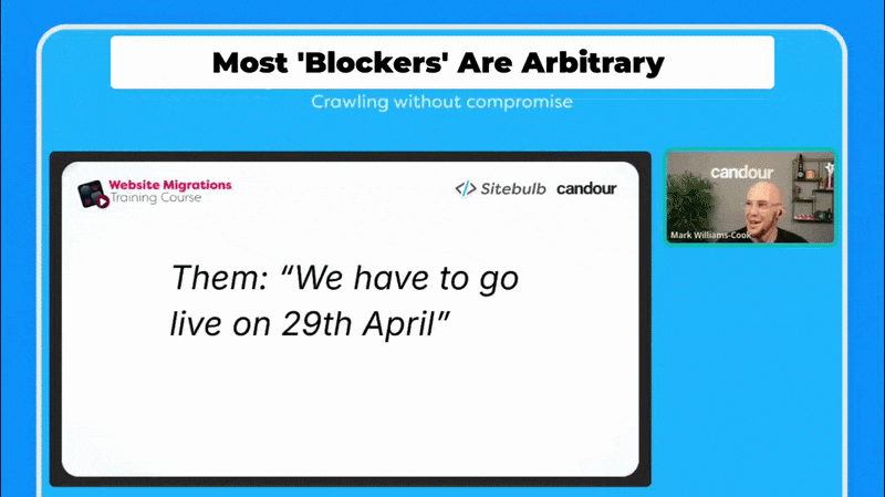 If you're in a tight spot with a migration timeline, it is always worth asking "why?", and then asking "why?" again. In so many instances, "unmoveable" dates have actually been quite arbitrary when pressed. 🤷♂️ Once you've established they are actually arbitrary (it just costs time and money), then you have an open door to present: "This is how much it costs to move the deadline back, and this is the cost of not moving it back." They can be difficult conversations, but it is an easier conversation than trying to explain why it wasn't done afterwards! 💵 Video from the Sitebulb x Candour webinar series on migrations.