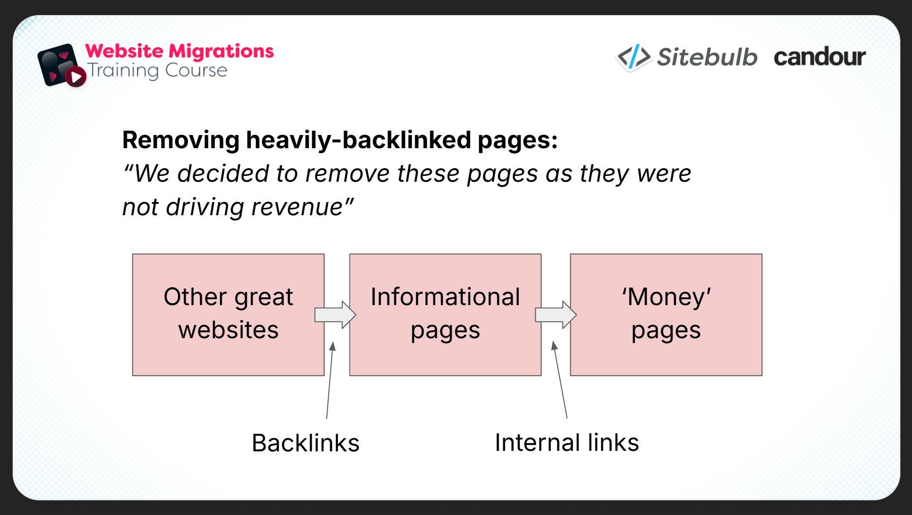 Removing "non-commercial" pages during a site migration can be a huge mistake, as I covered on the Candour x Sitebulb migration training webinar today. I have seen many cases where informational pages that are genuinely helpful attract hundreds of great links. And yes, while they generate traffic but no direct revenue, they do something more important: they pass that link equity to the commercial (money) pages, helping them rank. If you remove the informational pages with links, those links go to 404s, no equity flows to your 'money' pages — which soon become 'no money' pages. 🔥💸🔥 Sad trombone sound 🎵