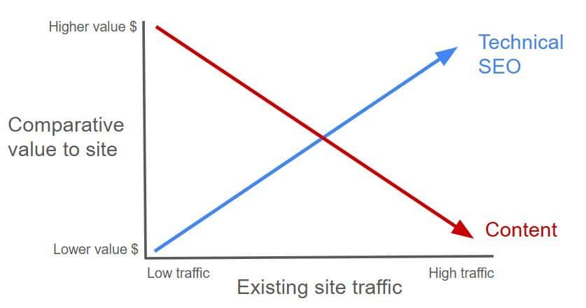 I’ve recreated the “meme” version of the original chart here that shows the directional relationship that is usually true between putting effort into site content or technical SEO. As a rule of thumb, your technical SEO payback grows with site traffic, whereas content decreases with it when compared to % gains.