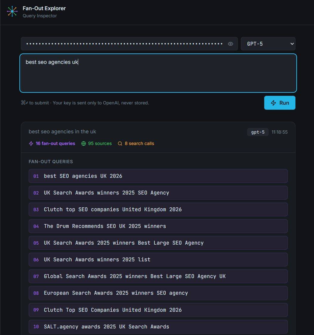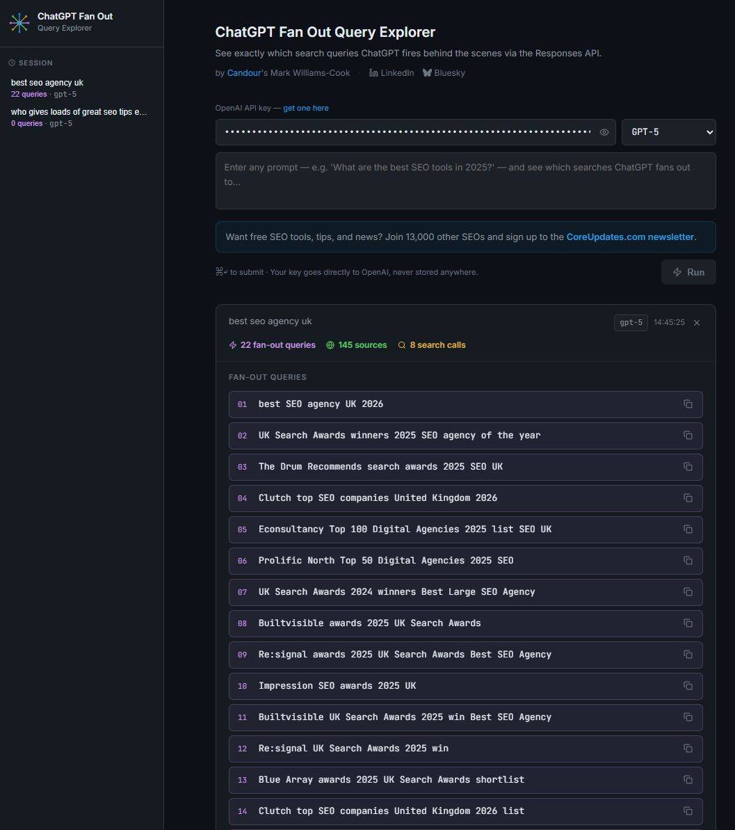 A few people were asking about the tool I screenshot yesterday for exploring ChatGPT query fan outs, so I have popped it onto Cloudflare Pages for free for you at QueryFan.com 🤓 This tool shows you the fan outs and web searches that are happening for any prompt, so you can get an idea of where you need to be visible to appear in retrieval-generated AI answers. I have a bigger tool coming to the same domain soon, but this should be fun for now, enjoy!