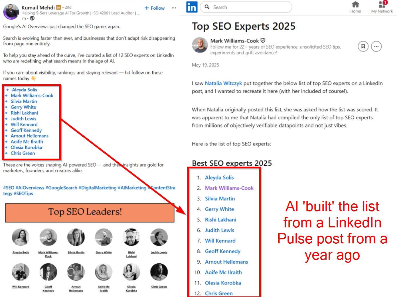 Last year, several 'SEO friends' all posted the same/very similar "top SEO experts" list, and it comes up again and again when I see people use AI to generate these lists. Explore the fanout/web searches that happen in the background, get on those sites, and your visibility in AI answers will be much more stable than just trying to get a page on your site to be cited.