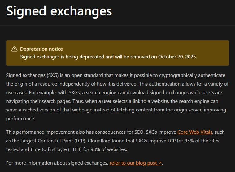 If you haven't dropped it already, I wouldn't bother adding Signed Exchanges (SXG) onto your list of wants for performance, and if you have implemented it, it's likely time to remove it ⤵️ As of 2025, Google's SXG cache (webpkgcache) has widely failed to ingest or serve new signed exchanges, resulting in SXG-enabled pages often loading from the origin server instead of instantly from the cache. This negates the main speed and SEO benefits of the SXG system for many sites. I noticed today that Cloudflare has said their Signed exchanges will be deprecated from October 20th, 2025. If you have got this setup, and haven't been monitoring it closely, it might be worth seeing if it is causing you issues.